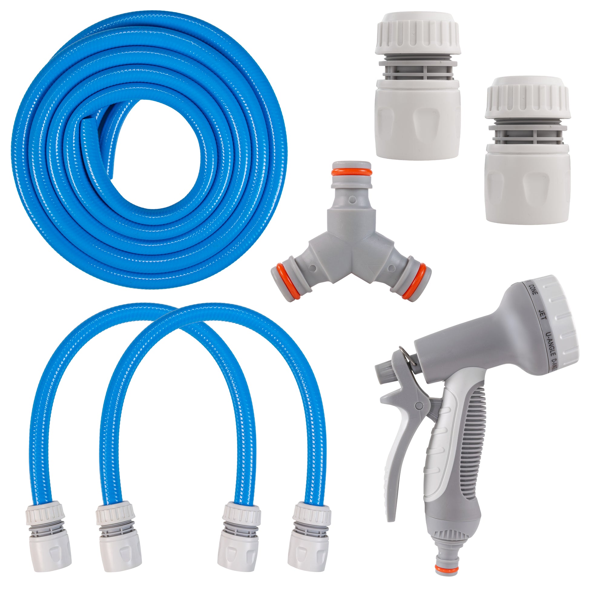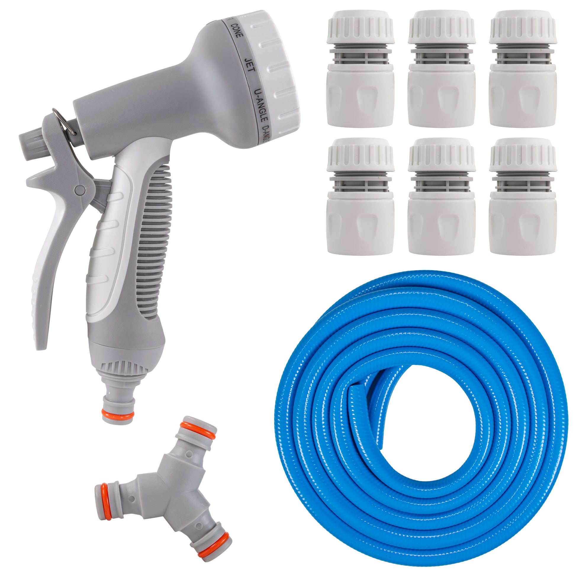 - Kit contains: Hose pipe, hose connectors, multi-pattern spray gun, three-way splitter