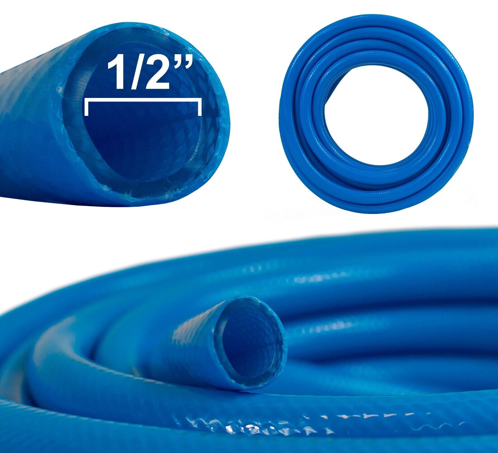 Our Blue Water hosepipes are ideal for heavy gardening and professional use. The reinforced kink resistant construction provides rigidity while maintaining flexibility, with a clear inner core and a blue outer layer made of reinforced PVC. Please note that this hosepipe is safe to use with potable drinking water and complies with European regulations, REG. (EU) 10/2011 for simulating liquids of types A, B, and C, making it suitable for food use. Each length of pipe comes with 2 standard 1/2" hose pipe connectors.