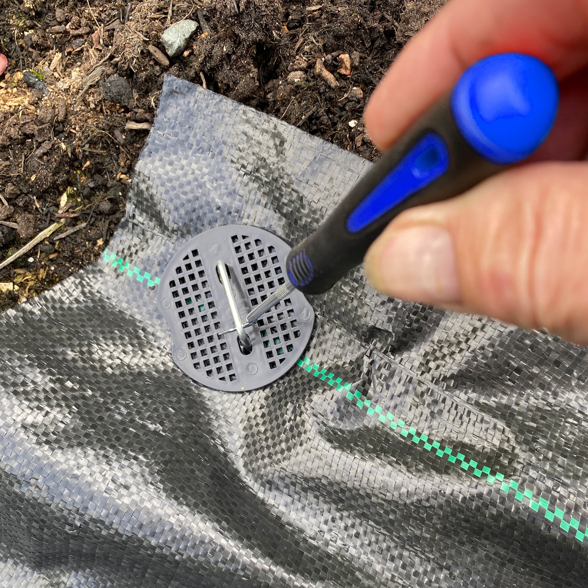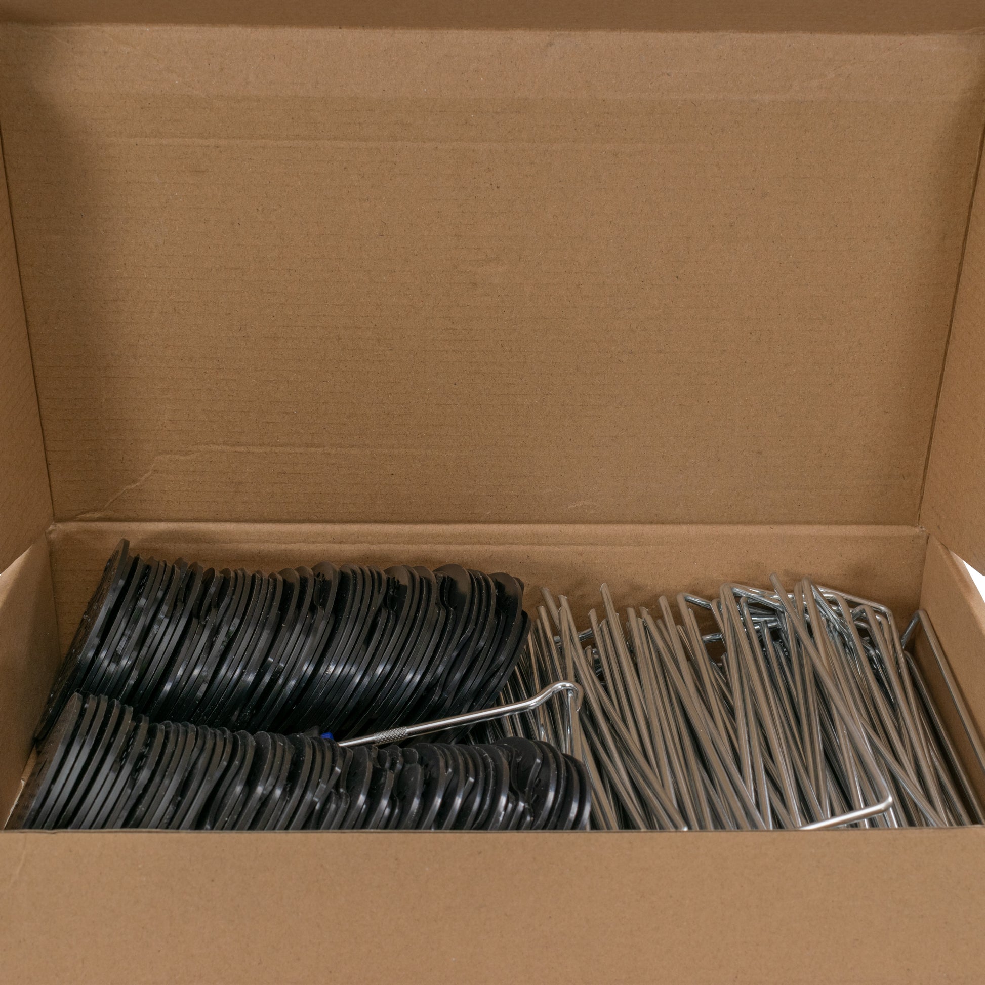 The Weed Control Membrane Pegs kit offers a reliable and durable solution for securing landscaping fabrics, featuring 6"/150mm robust metal pegs that outperform plastic alternatives in strength and longevity. Each peg is paired with a black buffer washer plate that enhances stability, prevents fabric tears, and extends the lifespan of the matting membrane. Designed to withstand harsh weather and heavy foot traffic, the metal construction ensures consistent performance for long-term landscaping projects. The kit includes a convenient hook tool for easy peg removal and repositioning, making maintenance and design adjustments quick and hassle-free. The Rubber Mallet features a sturdy wooden handle for a secure grip and a premium non-marring rubber head to deliver controlled strikes without surface damage. This all-in-one kit is essential for maintaining neat, secure, and weed-free outdoor spaces.