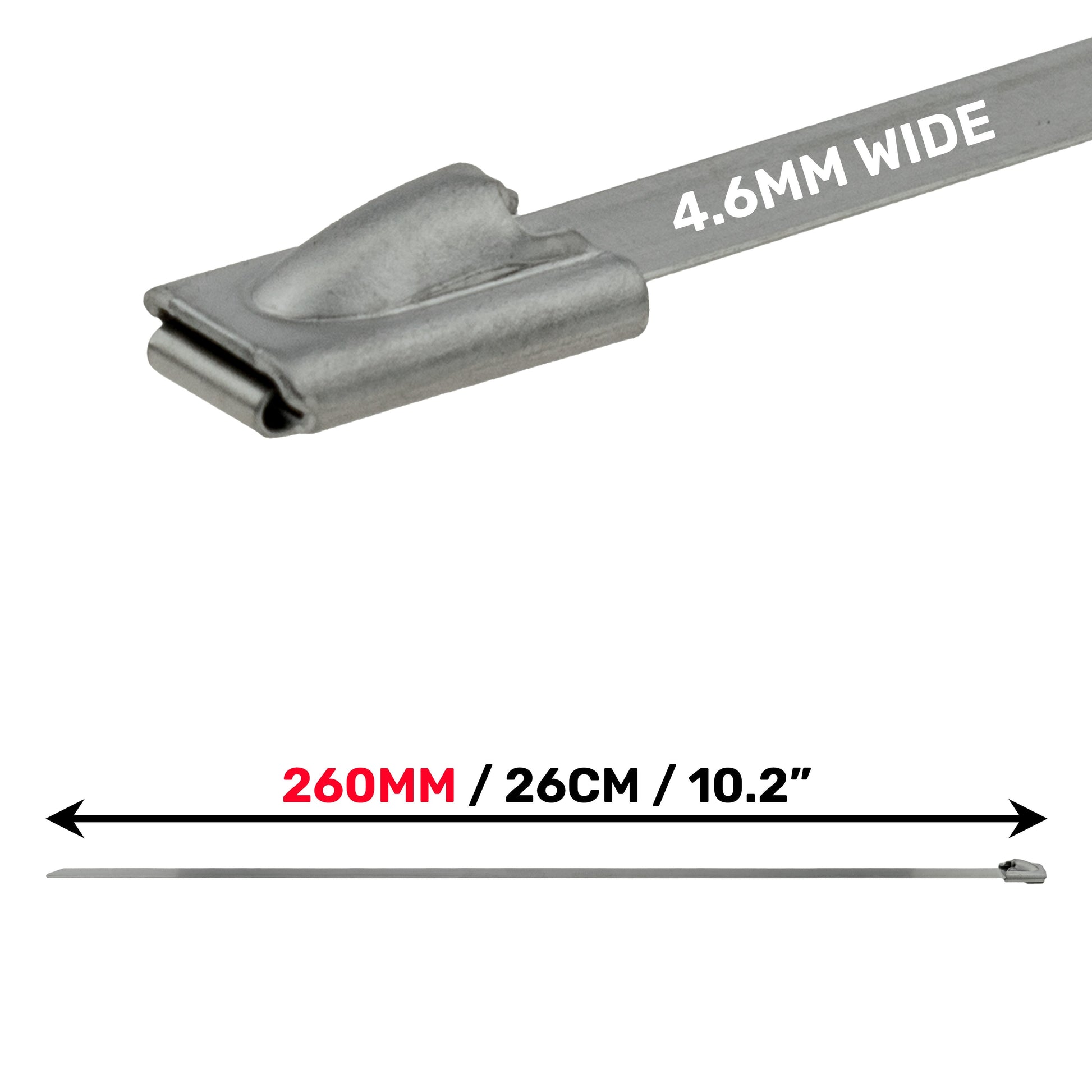 Each tie is 4.6mm x 260mm making them perfect for a variety of tasks. These cable ties have a breaking strength of 90kg. Other size stainless steel cable ties are also available, sold separately.